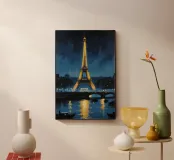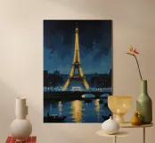 Questo incantevole dipinto a olio raffigura la Torre Eiffel illuminata dal suo bagliore dorato, che si riflette magnificamente sulla Senna. Le serene tonalità blu della notte creano uno sfondo perfetto, mentre le sottili sagome degli edifici e le luci delle lampade esaltano l'atmosfera romantica. Quest'opera d'arte cattura l'eleganza senza tempo e il fascino magico di Parigi sotto il cielo stellato, rendendola un capolavoro di bellezza notturna.