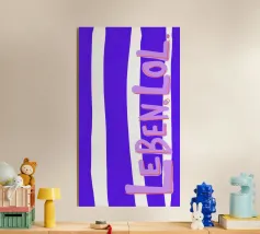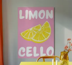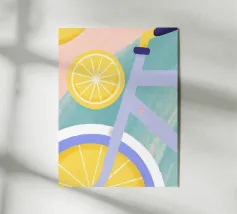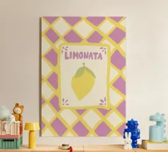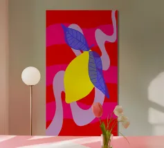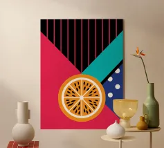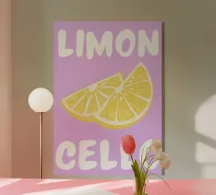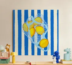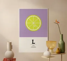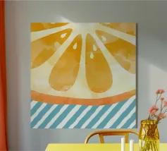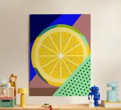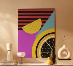 Disegno illustrativo con una fetta di limone su uno sfondo a righe bianche e viola. Fresco, moderno e un vivace richiamo visivo dal sapore estivo.