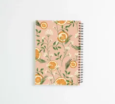 Motivo di arance, fiori e botanica con sfondo color pesca.