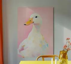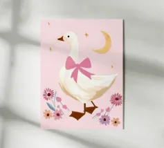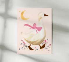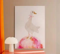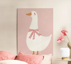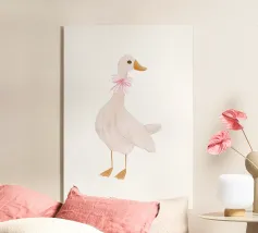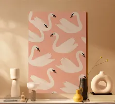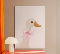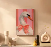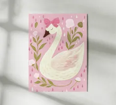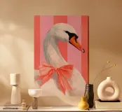 Testa di cigno dipinta a mano a guazzo con un vivace fiocco corallo su sfondo a righe arrossate. Luminosa tavolozza di colori pastello con tratti nitidi e un morbido tocco rétro. Perfetto per la cameretta o per un arredamento preppy.