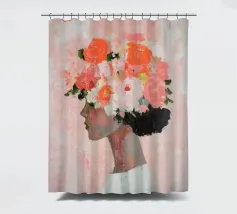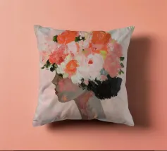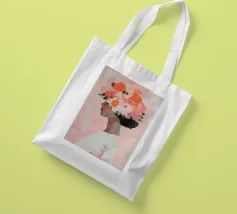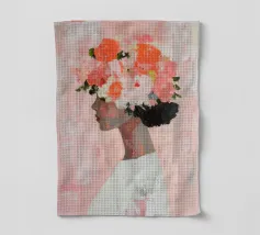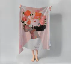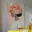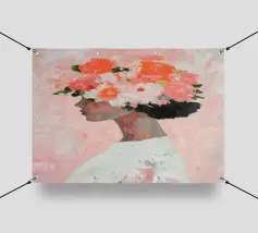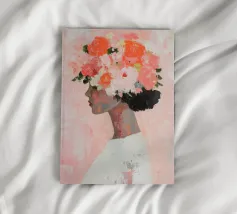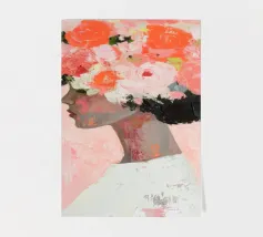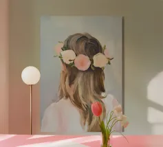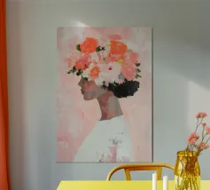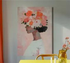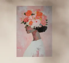 Un dipinto minimalista di una donna elegante con fiori tra i capelli su uno sfondo rosa. La donna indossa un abito bianco, con colori pesca e corallo che accentuano le spesse pennellate.