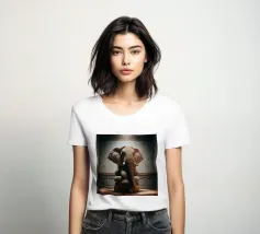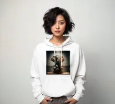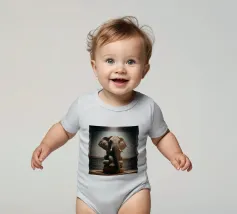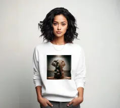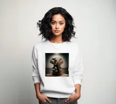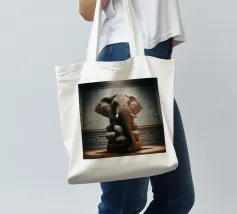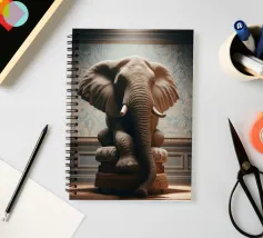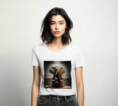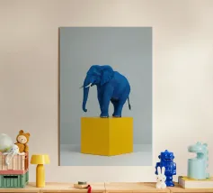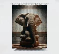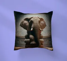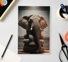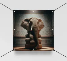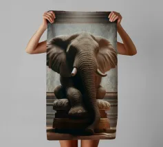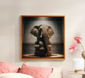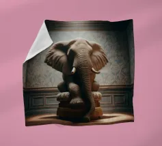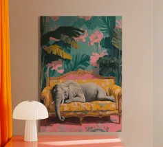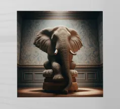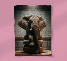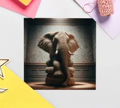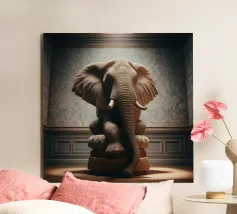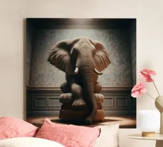 Un ritratto surreale e suggestivo che racchiude un'immensa forza in un contesto di raffinata sobrietà. Un elefante è seduto tranquillamente su uno sgabello imbottito, la sua presenza monumentale è attenuata dall'eleganza degli interni e dalla delicata luce che scende dall'alto. La scena appare deliberata e composta, trasformando la forza bruta in qualcosa di contemplativo e quasi cerimoniale.