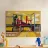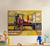 A view from an elevated train or platform shows a colorful, stylized urban landscape with bold geometric shapes and a strong sense of structure and movement.
