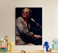 Un artista in un abito blu lucido con rifiniture rosse suona appassionatamente il pianoforte, indossando occhiali da sole oversize scintillanti mentre canta in un microfono.