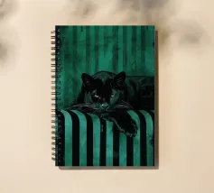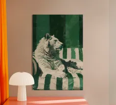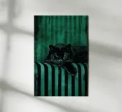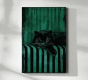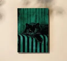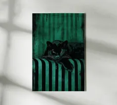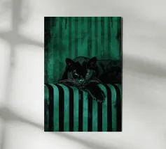 Una composizione umorale e pittorica che ritrae una pantera nera che riposa in tranquilla sospensione su un campo strutturato di strisce verticali verde intenso. La tavolozza sobria, dominata dallo smeraldo e dal nero ombreggiato, mette in risalto i luminosi occhi ambrati dell'animale, che diventano il punto focale dell'opera. Le texture ruvide dei pennelli e i contrasti tonali stratificati evocano un senso di tensione tra morbidezza e potenza, immobilità e forza latente. L'opera bilancia il realismo con la stilizzazione, trasformando la pantera in un simbolo di presenza controllata e di silenziosa intensità.