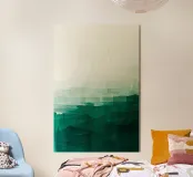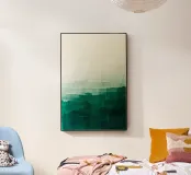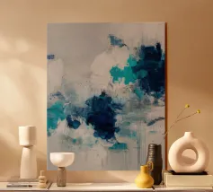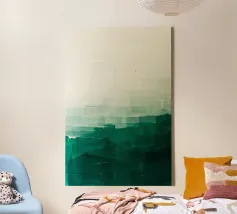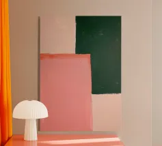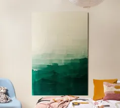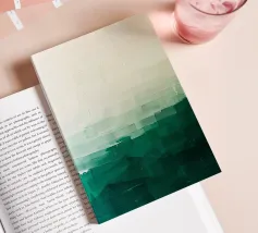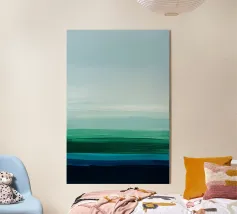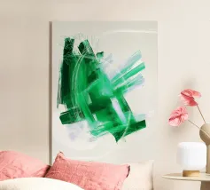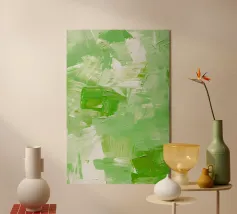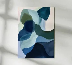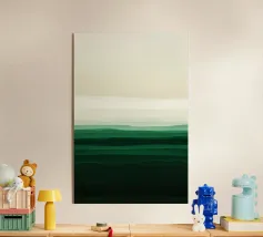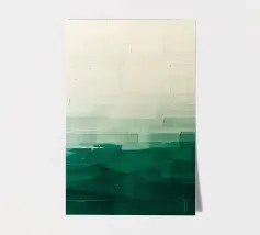 Un'espressiva composizione astratta costruita da blocchi pittorici stratificati che passano dai toni morbidi dell'avorio a quelli profondi dello smeraldo e del verde foresta. Le pennellate strutturate e le forme sovrapposte creano un senso di profondità geologica e di movimento silenzioso, evocando sedimenti, acqua e tempo. In equilibrio tra minimalismo e ricchezza materica, quest'opera è perfetta come stampa contemporanea su larga scala.