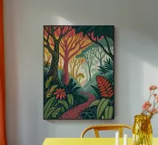 Un'illustrazione vivace e stilizzata che raffigura una stravagante scena di foresta. Un tortuoso sentiero rossastro conduce l'osservatore attraverso una fitta schiera di alberi colorati e fogliame lussureggiante e sovradimensionato. La tavolozza dei colori è ricca e varia, con verdi profondi, rossi, arancioni e accenni di blu e gialli più chiari, che creano un'atmosfera fantastica e invitante. Lo stile artistico è audace e grafico, e mette in risalto le forme e le texture rispetto ai dettagli realistici.