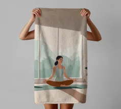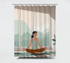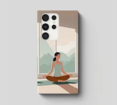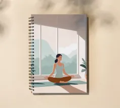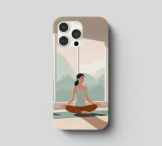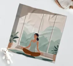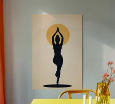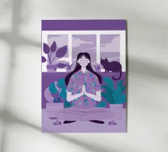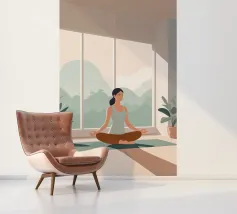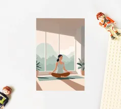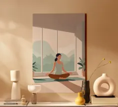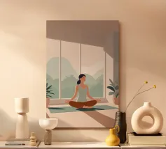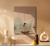 Un'ariosa illustrazione minimalista di una donna che pratica yoga in una stanza illuminata dal sole e piena di piante. La tavolozza rilassante di verdi e beige irradia calma e concentrazione, perfetta per studi di yoga o angoli di relax.
