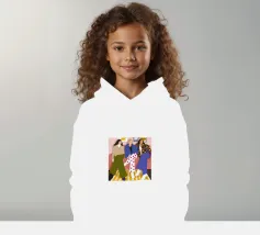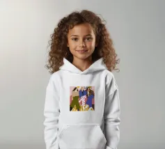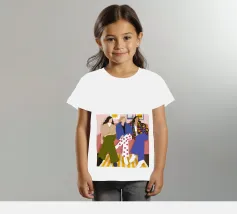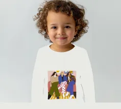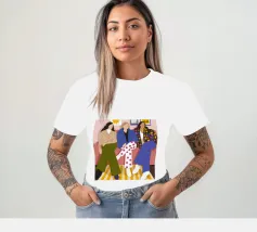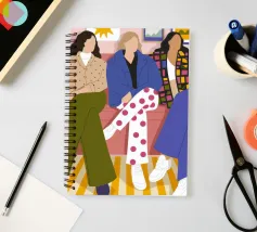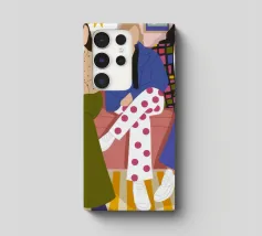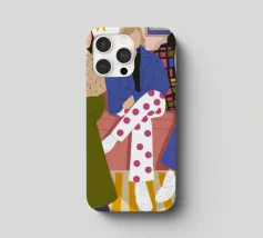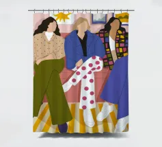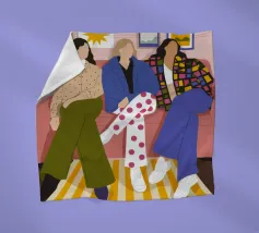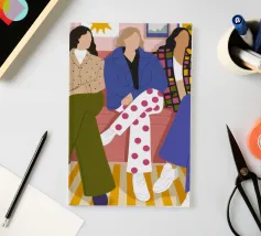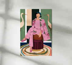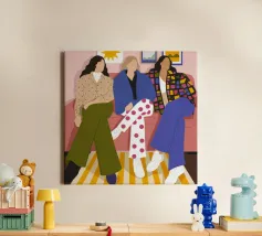 Questa opera d'arte mostra tre individui seduti su un divano rosa in un salotto elegante. Sono vestiti con abiti alla moda, tra cui pantaloni a pois, una giacca a quadri e un maglione beige, evidenziando la moda urbana contemporanea.