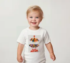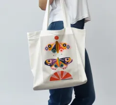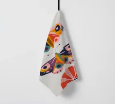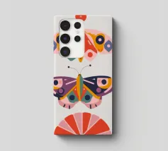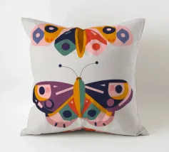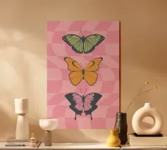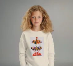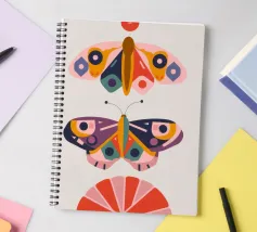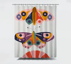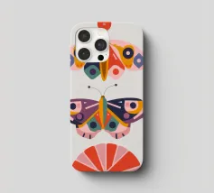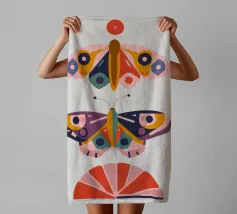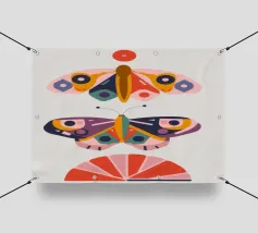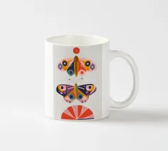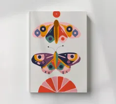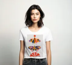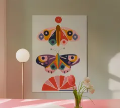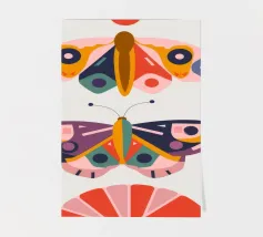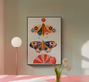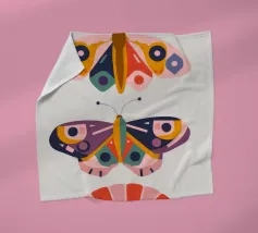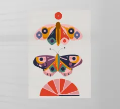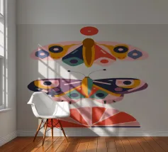 Una disposizione simmetrica di due farfalle colorate su una forma geometrica a ventaglio, che unisce la natura al design moderno.