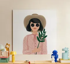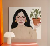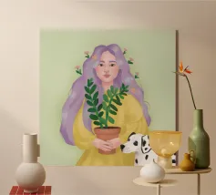 L'opera raffigura una figura che tiene in una mano una pianta in vaso. La figura indossa un maglione beige e lo sfondo è minimalista, sottolineando l'equilibrio tra natura e presenza umana.