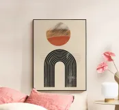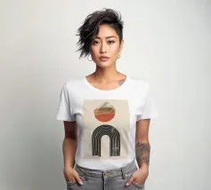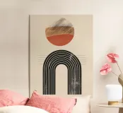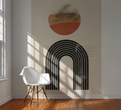 Questo design combina un'armoniosa palette di colori caldi della terra con forme geometriche precise. L'arco curvo nero si integra perfettamente con il cerchio astratto, che presenta una texture legno e un colore rosso ruggine. Una composizione minimalista che irradia calma e stile. Ideale per murales moderni, tessuti o accessori che aggiungono eleganza e personalità a una stanza.
