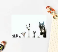 Questa stampa fotografica presenta un gruppo di animali da fattoria, tra cui un maestoso cavallo, una giocosa capra, un saggio gufo, un soffice lama, un sorprendente emu, un curioso gatto nero e un regale ariete. Questa stampa unica celebra la bellezza degli animali domestici ed è perfetta per gli amanti degli animali e della natura.