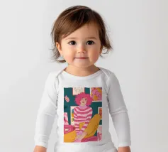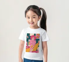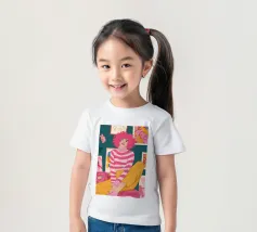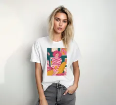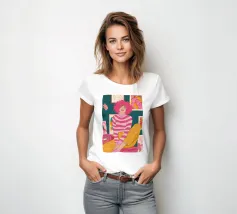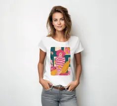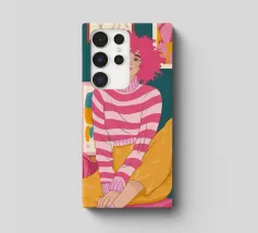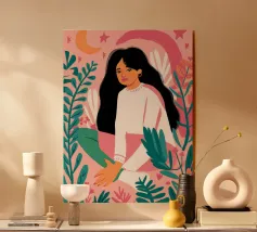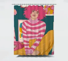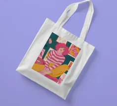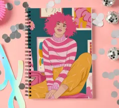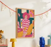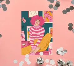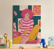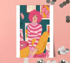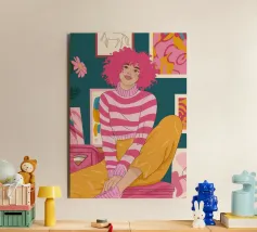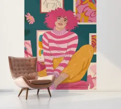 Una persona con i capelli rosa, vestita con un abito a righe, siede in una stanza colorata e piena di opere d'arte, che simboleggiano la creatività vibrante e l'espressione di sé.