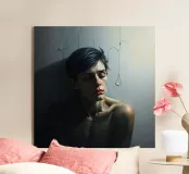 Una persona con i capelli corti siede contro un muro in una stanza illuminata in modo soffuso, trasmettendo emozioni profonde e introspezione. L'atmosfera è pesante e contemplativa, e rafforza lo stato d'animo.