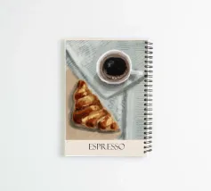 Una scena calda e invitante con una ricca tazza di caffè espresso posta elegantemente su un tavolo di legno. Il caffè scuro, ricoperto da un delicato strato di crema, si trova accanto a un croissant sfogliato e dorato, i cui strati di burro scintillano sotto una luce morbida e naturale. La composizione emana un'atmosfera accogliente e mattutina, con sottili riflessi sulla superficie della tazza di caffè e un accenno di vapore che sale dall'espresso. Lo sfondo è sfocato e si concentra sulla consistenza e sul calore del caffè e del pasticcino, invitando lo spettatore a concedersi un momento di tranquillo lusso.
