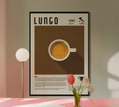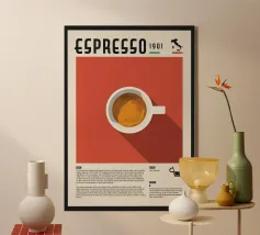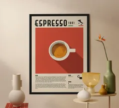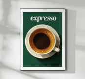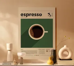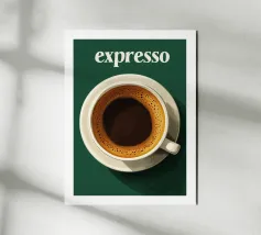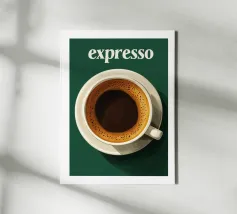 Vista dall'alto di un espresso ricco di crema in una tazza bianca su sfondo verde intenso con scritte vintage in grassetto. Questa accogliente stampa sul caffè conferisce un fascino da bar alle cucine, alle sale da pranzo e agli angoli caffè. Perfetta per gli angoli barista di caffè e ristoranti. Si abbina facilmente con piastrelle bianche, accenti in legno scuro e ottone e colori neutri caldi per un'atmosfera mattutina raffinata.