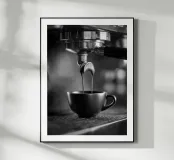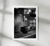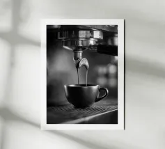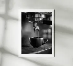 Fotografia in bianco e nero dell'estrazione di un espresso: due getti di crema fluiscono dal portafiltro cromato in una tazza opaca, con riflessi metallici e un morbido bokeh. Una scena grafica che cattura l'arte del barista, l'aroma e il rituale mattutino. Perfetto come opera d'arte da parete o come poster per cucine, angoli caffè, salotti o caffetterie, aggiunge un tocco industriale moderno e accogliente. Ideale per gli amanti del caffè e per gli arredatori minimalisti.