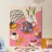 This warm composition illustrates a table adorned with a teapot, cups, and assorted fruits. The whimsical pink tablecloth and abstract patterns enhance its inviting charm.