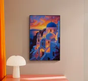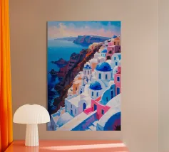 Un'ipnotica pittura a olio che cattura l'incantevole bellezza di Santorini al tramonto. Le iconiche chiese dalle cupole blu sono immerse nella calda luce di un tramonto vibrante, con sfumature di arancio, rosa e viola che si fondono con il blu profondo del mare. Le strutture a cascata imbiancate a calce creano un'armonia visiva sorprendente, ornata da bouganville in fiore che aggiungono sprazzi di colore vivace. Questo ritratto senza tempo racchiude il romanticismo, la serenità e i panorami mozzafiato dell'isola.