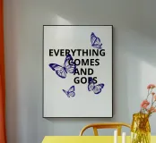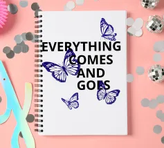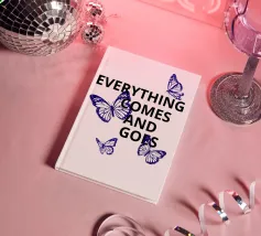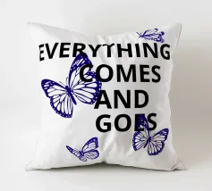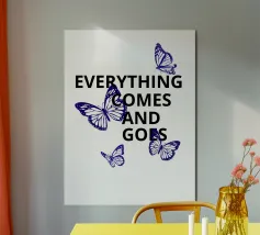 Il testo nero in grassetto che recita "Everything Comes and Goes" è circondato da quattro farfalle blu. Le farfalle sono posizionate intorno al testo, aggiungendo un senso di movimento e trasformazione.