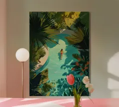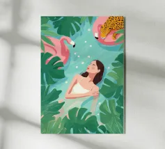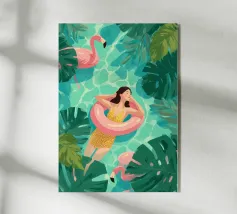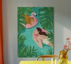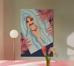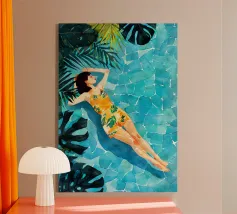 La luce del sole filtra attraverso le foglie tropicali mentre lei galleggia tranquillamente in una piscina, completamente a suo agio. Il mondo intorno a lei si dissolve in colori tenui e forme tranquille: palloni da spiaggia, sandali e il tempo stesso vengono lasciati alle spalle. Questo pezzo è un'espirazione visiva che ricorda di fermarsi, respirare e lasciare che il riposo sia sufficiente.