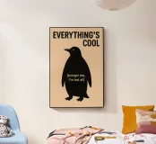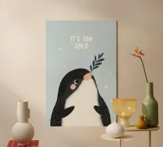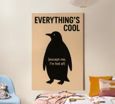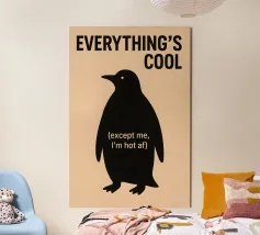 Questo pinguino vive in un look da gelato su una calda carta non patinata e proclama seccamente "Everything's Cool", mentre al centro dell'immagine dice "except me, I'm hot af". Un forte gioco di contrasti: figura fredda, messaggio caldo, tipografia chiara. Perfetto per il bagno, il corridoio o il capanno del giardino, e per chiunque non si prenda troppo sul serio. Un design che combina l'estetica classica dei poster con un'autoironia sfacciata.