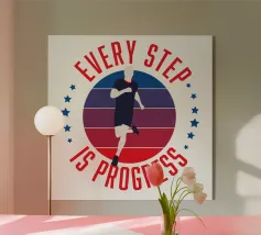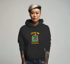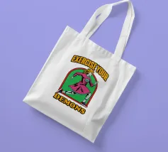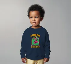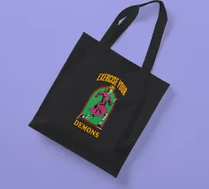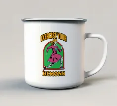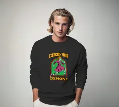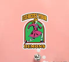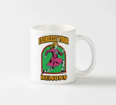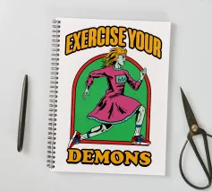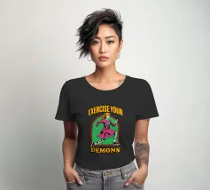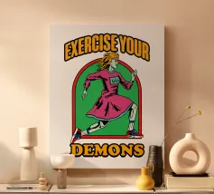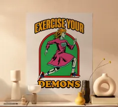 Un personaggio dinamico corre con determinazione sotto la frase "ESERCITA I TUOI DEMONI". I colori vivaci e l'abbigliamento atletico conferiscono all'immagine un'atmosfera motivante e vivace.