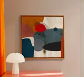 Composizione astratta con sfumature di blu alzavola intenso, arancio bruciato, terracotta, grigio, rosso e bianco sporco. La composizione è equilibrata e dinamica, con un senso di movimento ed energia. I colori e i toni sono coerenti e si fondono armoniosamente, creando un'atmosfera rilassante e contemplativa. Lo stile complessivo è quello dell'arte astratta moderna, che evoca una sensazione di semplicità e di esplorazione visiva.