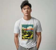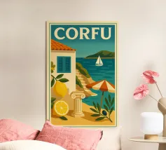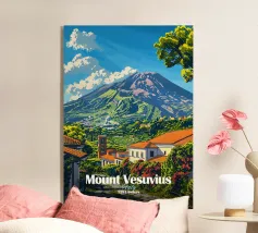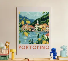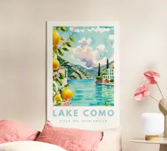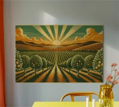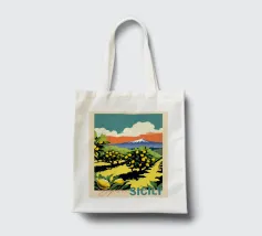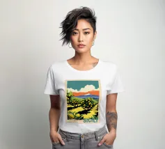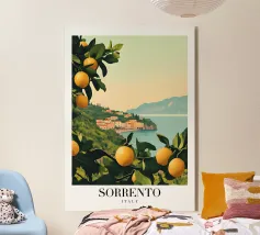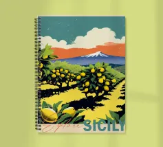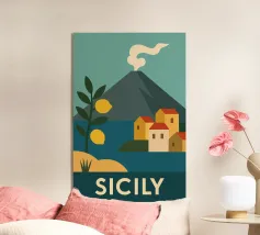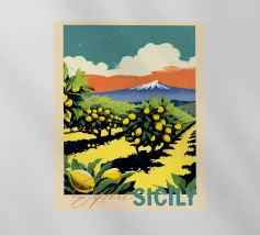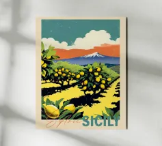 Un poster di viaggio in stile vintage che cattura l'essenza della Sicilia, con vibranti limoneti in primo piano e il maestoso Monte Etna sullo sfondo. La ricca tavolozza di colori e l'audace composizione evocano il calore e la bellezza dell'isola mediterranea.