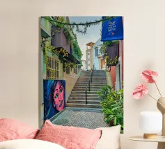 Tra le mura storiche di Santorini, in Grecia, uno sguardo intenso attira l'attenzione: un murale artistico di una donna i cui occhi sembrano guardare dritto nell'anima. Sullo sfondo si ergono la cupola e il campanile di una tipica chiesa greco-ortodossa. L'interazione tra street art e architettura storica racconta i contrasti, l'identità e l'espressività di questa affascinante isola.