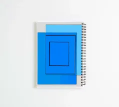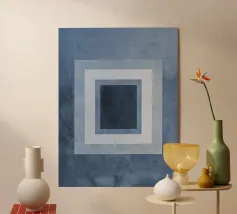 Questo dipinto astratto presenta una composizione geometrica minimalista basata sulla sovrapposizione di quadrati e rettangoli. La tavolozza dei colori è limitata a diverse tonalità di blu, da un ciano chiaro a un intenso blu medio. Un rettangolo più grande di colore azzurro è parzialmente coperto da un quadrato più scuro, che a sua volta contiene un quadrato più piccolo, centrato, del colore blu più scuro. I contorni neri sottolineano il quadrato centrale e quello interno, creando profondità e precisione visiva. L'opera emana calma e chiarezza.