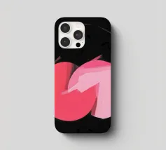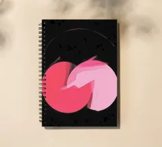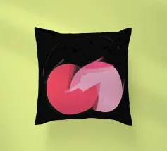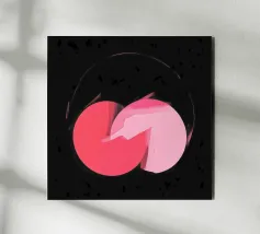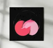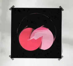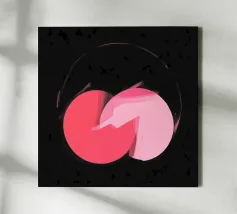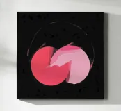 Dieses abstrakte Bild zeigt zwei sich überlappende Kreisformen in Rosatönen, die zentral auf einem fast schwarzen, strukturierten Hintergrund liegen. Der linke Kreis ist in einem dunkleren, kräftigen Rosa gehalten, während der rechte Kreis ein helleres Rosa aufweist. An der Überlappungsstelle scheinen die Farben mit breiten, sichtbaren Pinselstrichen ineinander überzugehen. Ein dünner, angedeuteter Kreis in hellem Rosa umgibt die zentrale Form. Der dunkle, körnige Hintergrund mit leichten Spritzern erzeugt einen starken Kontrast und verleiht dem Bild eine geheimnisvolle Atmosphäre.