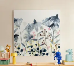 Questo acquerello d'atmosfera cattura fiori selvatici che si stagliano in una luce morbida e dorata. Le pennellate sciolte e la tavolozza di colori indaco, ocra e grigio creano un delicato equilibrio tra dettaglio e astrazione.