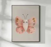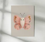 Una graziosa farfalla è raffigurata frontalmente con le ali leggermente arrotondate e aperte e un'espressione sorridente. Le sue delicate antenne, le guance rosee e il corpo dalla texture sottile creano un personaggio affascinante e commovente, pieno di leggerezza e gioia. Perfetta per camerette, nursery o spazi per bambini ispirati alla natura, questa decorazione murale a forma di farfalla dona morbidezza, calore e un delicato senso di fantasia a qualsiasi interno.