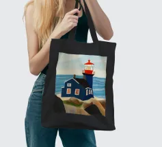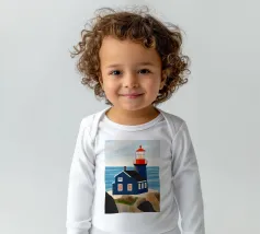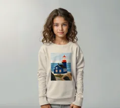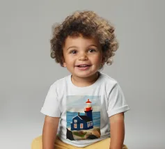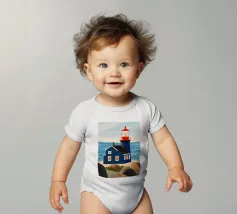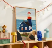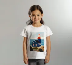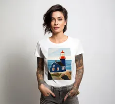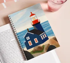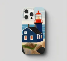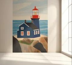 L'immagine mostra un faro con cupola rossa e un vicino edificio blu con finestre bianche. Il mare si estende sullo sfondo, mentre le rocce sono visibili in primo piano. Lo stile è grafico e moderno: linee pulite, colori decisi e forme piatte conferiscono all'immagine un'estetica stilizzata, quasi minimalista. Appare semplice, ma invitante e armonioso.