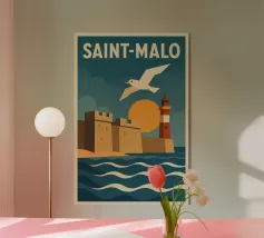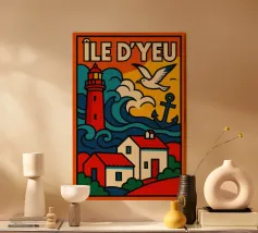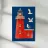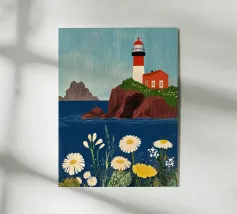 L'immagine mostra un suggestivo faro rosso con tetto nero e balaustra bianca. Due finestre ornano la facciata, mentre tre gabbiani completano il motivo marittimo - uno seduto, due in volo. Lo sfondo blu scuro crea un forte contrasto e rafforza l'atmosfera serena e chiara. Stilisticamente, l'immagine è illustrativa e minimalista, con linee pulite e una palette di colori vivaci. I colori decisi e la rappresentazione semplificata conferiscono al motivo un'estetica moderna, quasi grafica, che irradia calma e vagabondaggio allo stesso tempo.