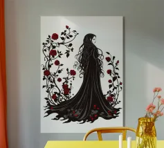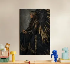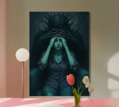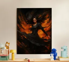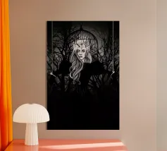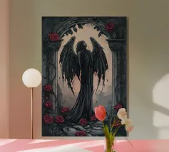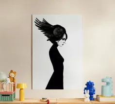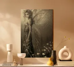 Una fata malinconica vestita di nero siede su un ramo nodoso e dall'aspetto antico. I lunghi capelli le ricadono sulle spalle e lo sguardo è abbassato dalla malinconia. Le ali strappate e trasparenti, che ricordano le foglie appassite, sono particolarmente suggestive. L'intera scena è caratterizzata da colori scuri, con forti contrasti tra le zone chiare della pelle e il nero profondo dello sfondo. L'atmosfera è misteriosa, triste e fiabesca, quasi come un momento di un romanzo dark fantasy.