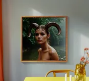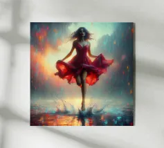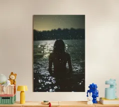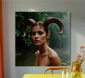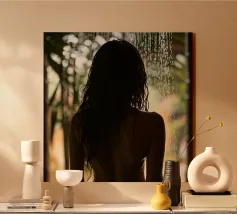 I suoi occhi spalancati brillano come se si fosse appena svegliata da un sogno. Le gocce sulla sua pelle brillano come luce liquida e il suo sguardo, sensuale e penetrante, cattura i segreti della foresta. Il tempo sembra essersi fermato, l'acqua sussurra silenziosamente storie. La nebbia porta via i suoi pensieri mentre affonda nel tocco fresco dell'acqua. Un momento fugace, pieno di infinita bellezza.