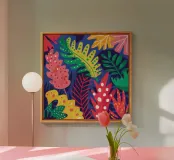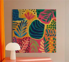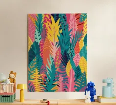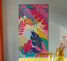 Un'esplosione cromatica e vibrante di foglie e fiori tropicali in uno spettro completo di colori crea un'esperienza di giungla intensamente energica, gioiosa e coinvolgente.
