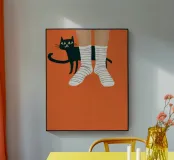 A humorous and charming illustration of a playful black cat attacking the socks on a person's feet. The simple composition against an orange background is a cute, funny, and relatable snapshot of life with a cat.