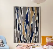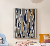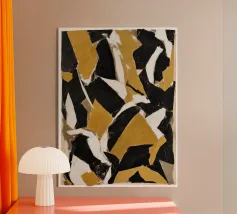 Questa composizione astratta presenta forme stratificate e lacerate disposte in un ritmo verticale, che evocano pietre frammentate, corteccia o piani architettonici mutevoli. Una palette sobria di nero carbone, grigio tenue, ocra caldo, bianco brillante e blu navy intenso crea un forte contrasto pur rimanendo sofisticata e calma. I bordi irregolari e le texture simili alla carta aggiungono profondità e movimento. Ideale per interni moderni, minimalisti o contemporanei, quest'opera è perfetta come elemento decorativo di grande impatto in soggiorni, uffici o ingressi.