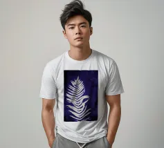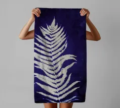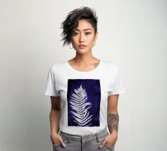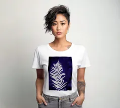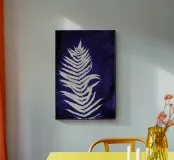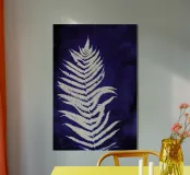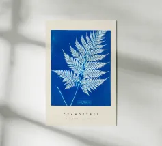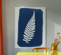 Questa opera d'arte in cianotipia presenta una delicata felce bianca su uno sfondo blu intenso. Creata attraverso un processo di stampa fotografica che utilizza la luce del sole, la cianotipia produce immagini dai toni decisi e blu. La semplicità della silhouette della felce contrasta magnificamente con il blu intenso, evidenziando l'eleganza naturale della pianta.