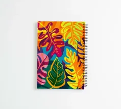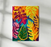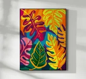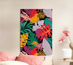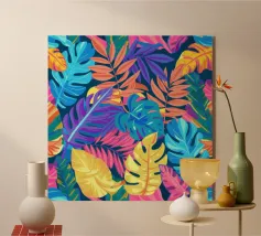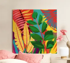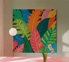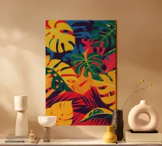 Una composizione intensa ed energica di foglie e forme floreali sovradimensionate in una tavolozza infuocata di rosso, arancio e fucsia, contrastata da verdi e blu profondi, che incarna un giardino selvaggio e indomito.