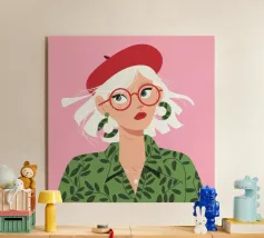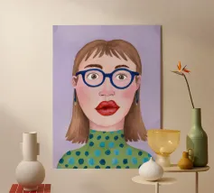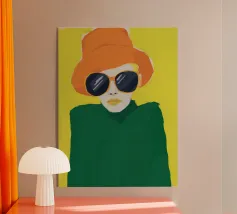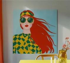Questo vivace ritratto pop art presenta una rossa sicura di sé che indossa audaci occhiali verdi da gatta e un dolcevita giallo. Il mix di elementi retrò e moderni crea una divertente dichiarazione di intelligenza, stile e impavida individualità.