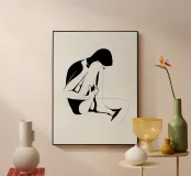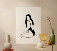 Un'opera d'arte dalle linee minimaliste raffigurante una figura femminile seduta, ripiegata su se stessa in un momento di tranquilla riflessione. Il gioco di forme nere decise e delicate linee di contorno crea intimità e forza, rendendo questo pezzo un'aggiunta sorprendente a qualsiasi interno moderno. Perfetto per gli spazi che abbracciano l'eleganza, la calma e il minimalismo contemporaneo.