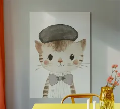 Un'affascinante illustrazione di un gatto bianco con macchie nere, che indossa un papillon rosso e una benda per gli occhi e interagisce giocosamente con un gomitolo di filo giallo. Lo sfondo è di un marrone tenue, che mette in risalto la personalità eccentrica e adorabile del gatto.