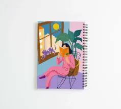 Illustrazione di una donna che si gode un momento di pace, leggendo un libro seduta su una sedia rosa accanto a una finestra soleggiata. Una grande pianta d'appartamento contribuisce all'atmosfera serena e accogliente di questo perfetto angolo di lettura.