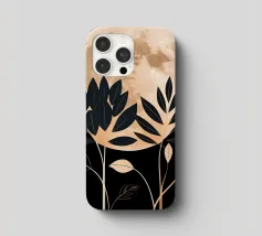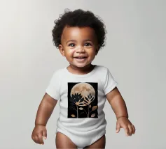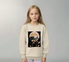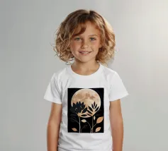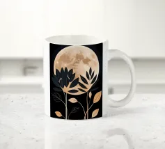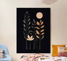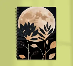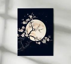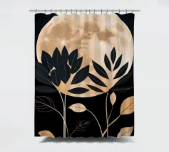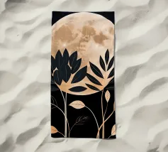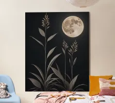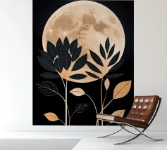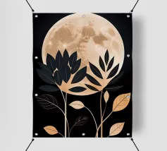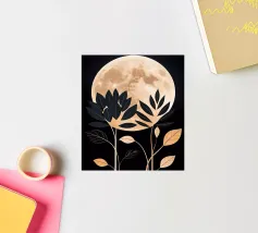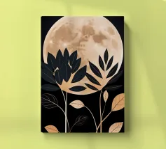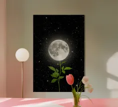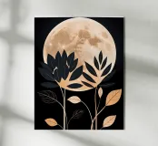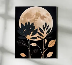 Questa accattivante stampa presenta una luna piena, immersa in un morbido bagliore dorato, su uno sfondo nero profondo. Due eleganti fiori stilizzati, uno con petali scuri e quasi iridescenti e l'altro con delicate foglie dorate, si ergono sotto il globo lunare. Il gioco di luci e ombre, unito agli intricati dettagli degli elementi floreali, crea un pezzo davvero ipnotico che aggiungerà un tocco di bellezza celestiale a qualsiasi spazio.