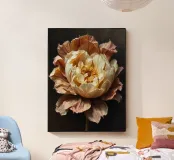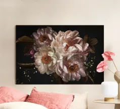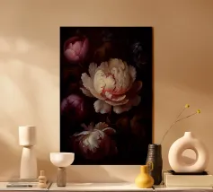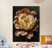 Una magnifica peonia, probabilmente di colore marrone o pesca antico, dispiega i suoi numerosi e delicati petali su uno sfondo scuro e drammatico. Il centro del fiore risplende di toni caldi e dorati, suggerendo una luce interna o un gioco di luce solare. I petali esterni mostrano belle e sottili variazioni di colore e consistenza, creando un senso di profondità e realismo. Questa composizione ravvicinata enfatizza l'intricata bellezza e la natura transitoria del fiore.